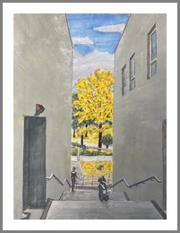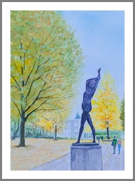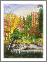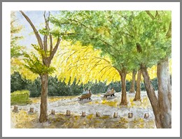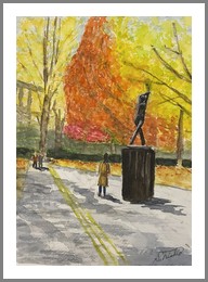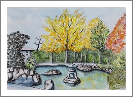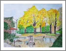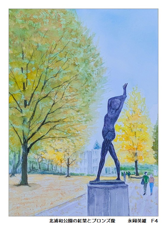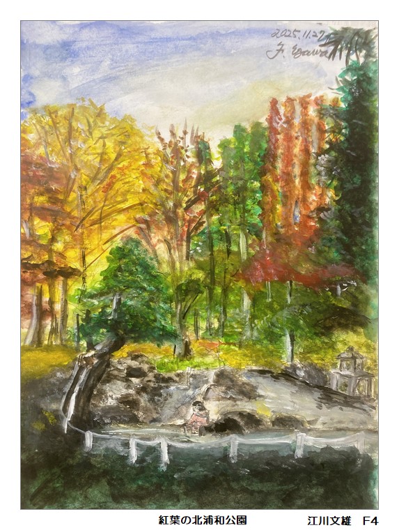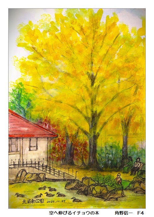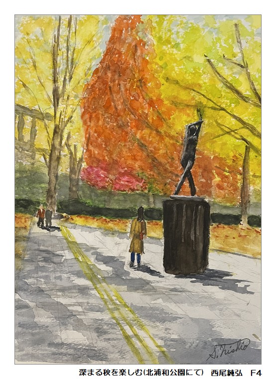 11月に入ってからの冷え込みにより紅葉の見頃は少し過ぎていましたが、公園は美術館見学や散策を楽しむ人々で賑わい、落ち着いた雰囲気が漂っていました。参加者6名は、それぞれの場所で思い思いに晩秋の風景を切り取り、心地よいスケッチの時間を満喫しました。活動の締めくくりは恒例の反省会です。作品の講評から始まり、様々な話題で話に花が咲き、メンバー間の交流を深めました。参加者は次回の総会での再会を誓い、実りある一日を終えて帰路に着きました。